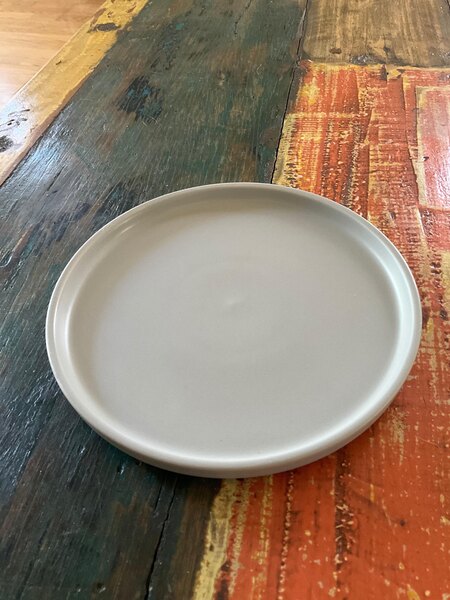 Perfect plate for a salad/small appetizer or dessert very sturdy seems very durable heavy duty, matte gray finish. Very modern appearance what is straight edges easily stackable with similar plates.