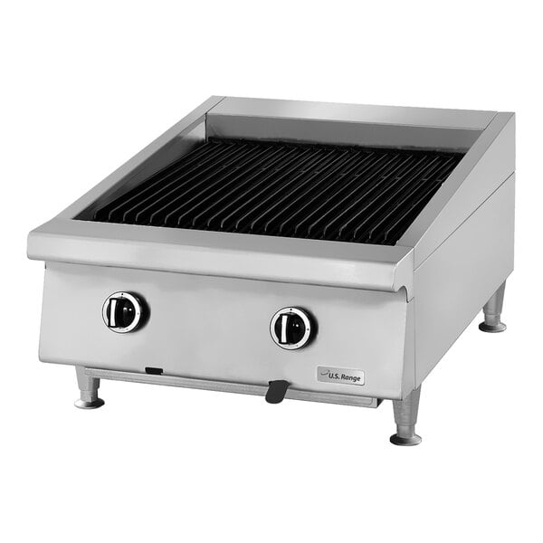 Perfect for the busiest snack bars or concession stands, the heavy-duty U.S. Range UTBG24-AB24 natural gas 24" ceramic briquette charbroiler with adjustable grates delivers the power and durability of a full-size charbroiler in a compact, countertop footprint! Featuring (2) 30,000 BTU cast iron burners, this unit is capable of quickly cooking up everything from burgers to chicken and even delicate seafood. Plus, thanks to the pre-formed ceramic briquettes, your food will give off a tantalizing smoky smell, making this charbroiler a great option for display cooking applications! One variable on/off valve controls each burner for simple operation.