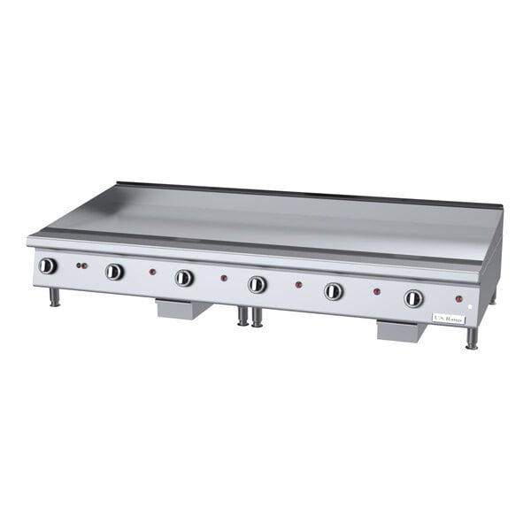 Perfect for diners, cafeterias, fine dining venues, and fast food restaurants, the U.S. Range UTGG72-G72M liquid propane 72" heavy-duty countertop griddle is built for easy and reliable operation. It features a 1" thick and 72" wide griddle plate, which is made of polished steel and includes 6 burners. Each burner has its own hi-lo manual control that adjusts the temperature from approximately 320 to 730 degrees Fahrenheit. A piezo pilot ignition system makes operation at the start of each day easy and safe.