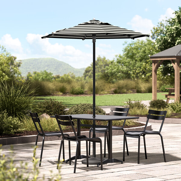 Enjoy the outdoors under the pleasant shade of this Lancaster Table & Seating 6' black and white stripe push lift black aluminum umbrella!