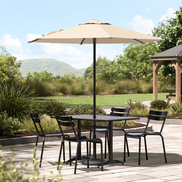 This umbrella's black powder-coated aluminum frame is built to withstand consistent use in your establishment. Its 1 1/2" pole diameter makes it compatible with select umbrella bases (sold separately), and you can prolong the life of your canopy with a compatible umbrella cover (sold separately). Reach for this Lancaster Table & Seating umbrella to enhance your outdoor space and keep guests happy and comfortable!