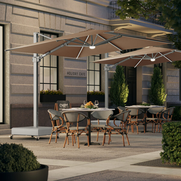 Lancaster Table & Seating 10' Square Tundra Tan Crank Lift Silver Aluminum Cantilever Umbrella with Lights