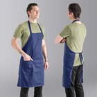 Bring a modern look to your staff's uniform with this Uncommon Chef 3004 royal blue customizable poly-cotton twill bib apron with 3 pockets! The mid-length hits around the knee for optimal coverage and mobility. It is great for baristas, bartenders, or bakers. Made of a strong, 7.5 oz., 65/35 poly-cotton twill, this comfortable apron is durable enough to withstand daily wear and tear. Its construction even protects against pilling and shrinkage to maintain your staff's professional, uniform look. Plus, compared to traditional cotton apparel, the apron's royal blue color won't fade regardless of how often you wash it.