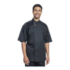 Make sure your chefs are dressed in the best with this Uncommon Chef Brac unisex black short sleeve chef coat with mesh back. This coat is made from a special blend of 55% polyester, 42% cotton, and 3% spandex. Durable enough to withstand busy kitchens, this light weight fabric allows for a high range of flexibility and movement, and it's stretchy and breathable, ensuring comfort throughout shifts. The short sleeve design helps keep you cool in hot kitchens, while the heather mesh back provides an athleisure look and wicks away moisture, keeping you dry and cool in hot kitchens. With its black color and silver mesh back, this coat combines comfort with a contemporary presentation to suit any foodservice establishment.