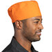 Bring color to your kitchen with this Uncommon Chef Epic carrot chef skull cap / pill box hat with hook and loop closure 0163. This hat is perfect for all back of house staff, including line cooks, pastry chefs, and caterers, offering a clean-cut look at a great price. A mesh keeps you from getting overheated in a hot kitchen. Made of 5.25 oz., 65/35 poly-cotton poplin, this hat is both lightweight and durable, and provides a longer-lasting option than 100% cotton hats. It features a hook and loop closure for an adjustable, perfect fit every time while keeping hair covered and out of your customers' food. Plus, with a rich, carrot orange color, this hat adds a pop of color to your otherwise conventional kitchen.