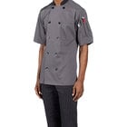 Dress your chefs in the best with this Uncommon Chef Havana unisex slate customizable short sleeve chef coat with mesh back 0494. Made from a 5.25 oz. 65/35 poly-cotton poplin, this jacket is lightweight comfortable, looks professional, and is durable enough to stand up to any foodservice environment. The poplin material is lighter, thinner, and smoother than a traditional twill chef coat. Each jacket has short sleeves to keep staff members cool in hot commercial kitchens. This jacket features a mitered breast pocket and utility shoulder pocket on the sleeve, which is the perfect spot to store thermometers or pens. Plus, it features a moisture-wicking half mesh back to help keep employees cool in hot kitchens. The mesh back matches the jacket's slate color for a more uniform look.