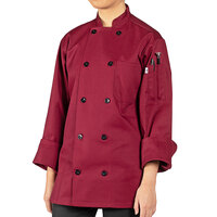 Dress your chefs in the best with this Uncommon Chef Moroccan 0405 unisex burgundy customizable long sleeve chef coat. Made from a 7.5 oz. 65/35 poly-cotton twill blend, this jacket is lightweight, comfortable, looks professional, and is durable enough to stand up to any food service environment. Each jacket has full-length sleeves with finished cuffs for a sleek, professional look. A utility shoulder pocket is on the sleeve of each jacket and is the perfect spot to store thermometers or pens.