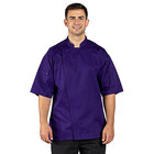 Dress your chefs in the best with this Uncommon Chef Venture Pro Vent unisex lightweight deep royal blue short sleeve chef coat with mesh back 0703. Made from a 5.3 oz. 65/35 poly-cotton fine line twill, this jacket is lightweight, comfortable, looks professional, and is durable enough to stand up to any food service environment. Each jacket has short sleeves to keep staff members cool in hot commercial kitchens. This jacket has a cell pocket on one sleeve and a utility shoulder pocket on the other sleeve, which is the perfect spot to store thermometers or pens. Plus, it features 4" side vents and a tonal half-mesh back to help keep employees cool in hot kitchens.