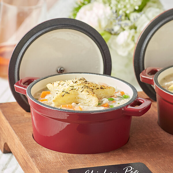 Whether you are preparing mouthwatering appetizers or flavor-filled desserts, this premium mini serving dish is the perfect addition for any professional chef. Not only designed with functionality in mind, but the pot's trendy, deep red color is sure to grab the attention of your patrons for an eye-catching display, making it perfect for oven-to-table use, buffets, or open kitchens.