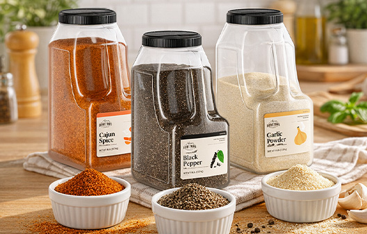 Stock up on essential kitchen herbs and seasonings with Hometown Provisions bulk wholesale spices, including black pepper, onion powder, and cloves.