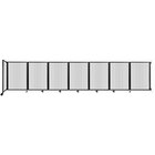 This room divider features a strong and durable aluminum frame. Its non-marking, locking casters make it easy to position in your area. Plus, their low center of gravity reduces noise and increases safety. The panels' clear poly polycarbonate material is easy to clean for a pristine appearance. This divider features 7 360-degree rotating panels as well as 1 full-sized end panel fixed at 90 degrees for a total of 8 panels to promote stability. Additionally, this divider features a versatile 19' 6" x 4' size so that you can accommodate many different setups. Its wall mountable design also allows you to conveniently and easily anchor the end of the divider with the included parts so that it stays in place. With this room divider, you will have unlimited configuration options!