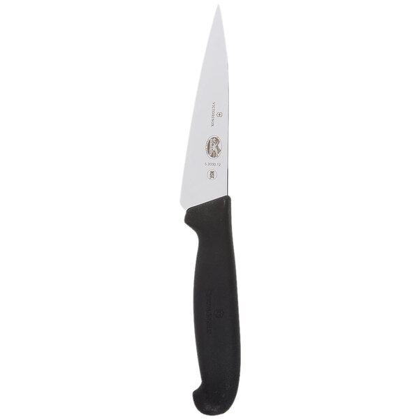 The Victorinox 47556 5" serrated chef knife features a sharp, pointed blade that makes quick work of a variety of common kitchen tasks. Designed for exceptional durability, Victorinox lasts up to 60% longer than typical knives, making this piece a valuable workhorse. The perfect addition to your knife collection, this knife is sure to become a favorite in any kitchen!