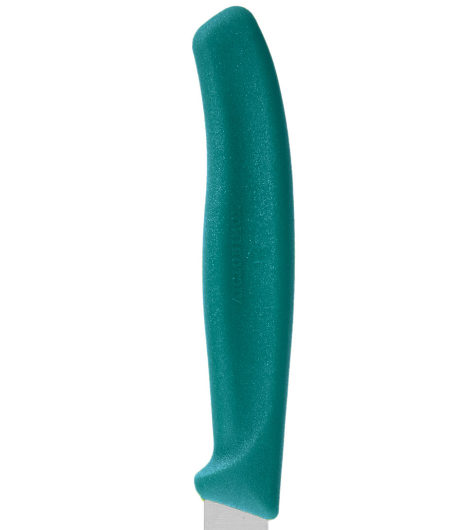 This knife features a kale green handle, perfect for color-coding kitchen tasks and maintaining a sanitary work environment. It also features an ergonomic, slip-resistant grip for a comfortable hold.