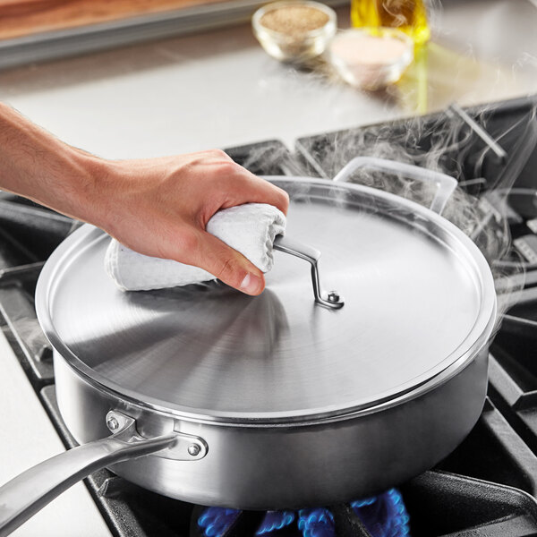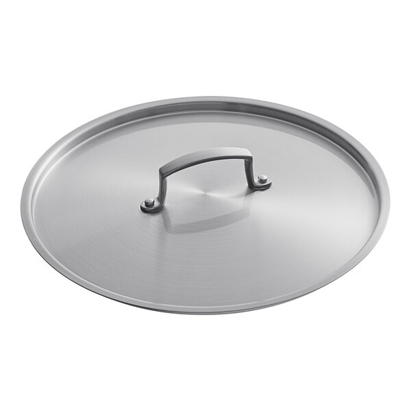 This lid features a premium tri-ply design with a 430 stainless steel exterior that provides superior durability to stand up to the rigors of everyday use in high-end restaurants and catering kitchens. Its aluminum core is expanded throughout its entirety to ensure uniform heat distribution, helping to eliminate hot spots in your mouthwatering creations, delivering a consistent product and leaving your guests craving more.