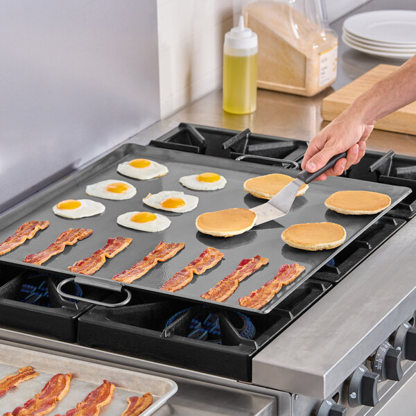 amazing griddle, have been using it for almost just over 4 years and still going strong. eggs no problem 8 pancakes is a breeze. want to fry bacon well there is room for 2 packs. most important thing to remember this is large and will fit best on a professional stove but also keep in mind the middle will not get as hot. do not wash with soap or scrub since that will rub off all the goodness that makes it non-stick. have recommended this over and over and would buy again in no time.