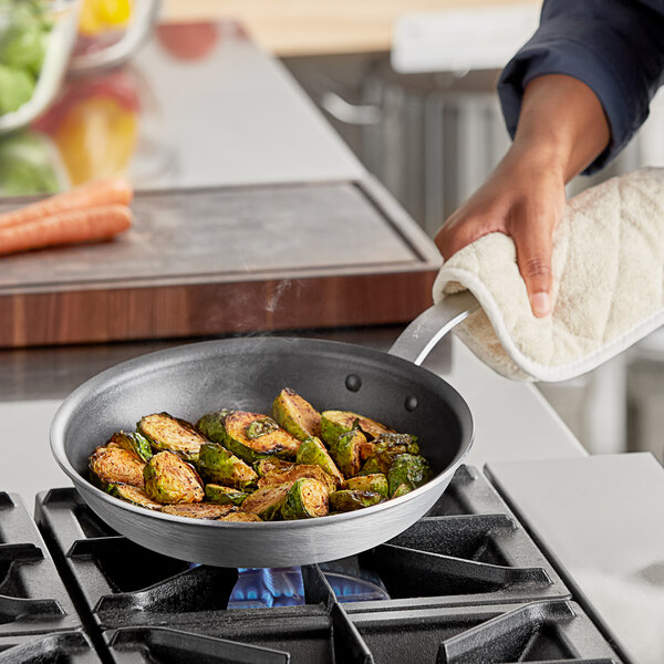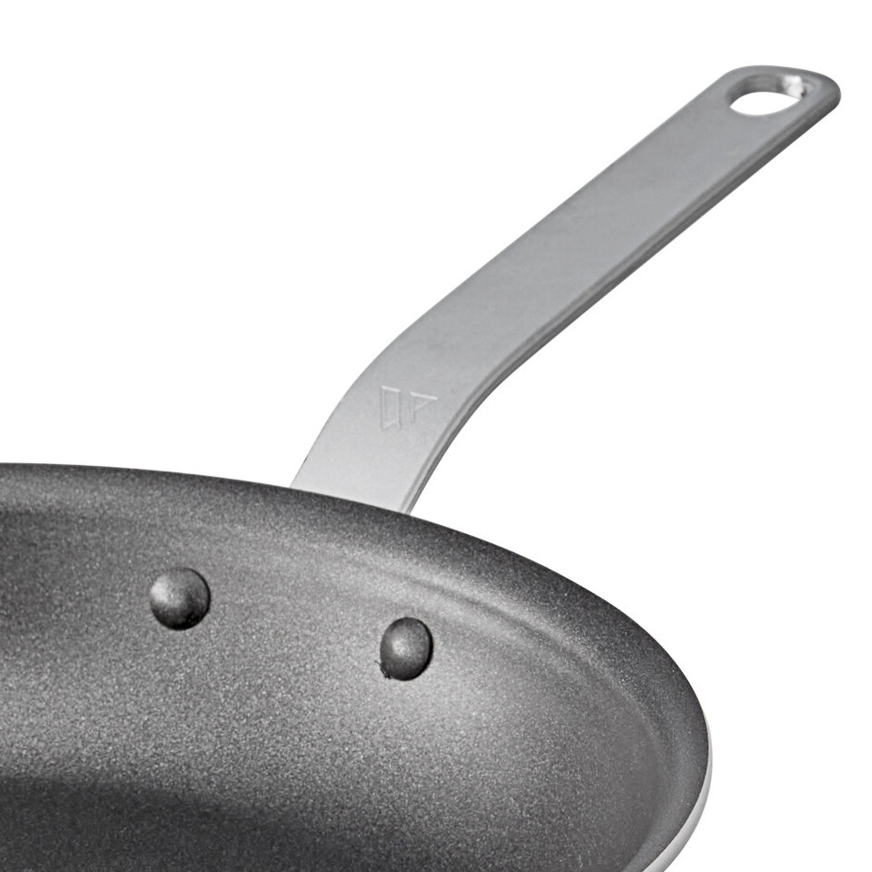 The ergonomic, plated handle design offers comfort and has a hanging hole that allows for easy hanging storage in your busy kitchen. The pan's aluminum material provides rapid and even heat distribution, eliminating hot spots and delivering consistent cooking results every time. The curved side walls prevent excess steam when in use, making it a versatile and efficient tool for a variety of cooking applications.