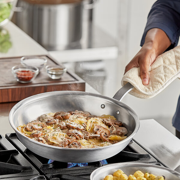 The curved side walls of the pan make it easy to transfer food, while the natural finish allows for superior browning, searing, and frying of your establishment's favorite foods.