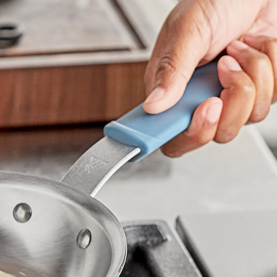 The ergonomic, plated handle design offers comfort and reduces heat transfer, ensuring a safe and secure grip during use. It has a hanging hole that allows for easy hanging storage in your busy kitchen. Additionally, it fits right into the pan's oven-safe silicone grip that can stand up to 450 degrees Fahrenheit of continuous use and up to 600 degrees Fahrenheit of sporadic use.