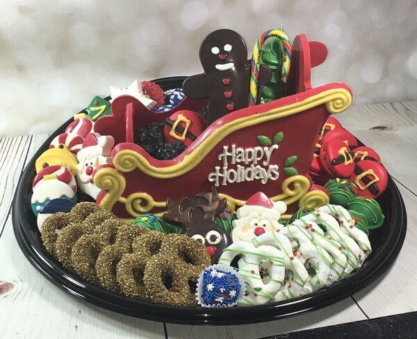 I use the 16" Thermoform Catering/Deli Tray with the 16" Clear PET Plastic Round Catering High Dome Lid for cookie platters. The plastic of these trays can be a bit slippery and if cookies aren't packed properly, they slide around. The 16" tray holds up to 3 dozen of my 3" sugar cookies.