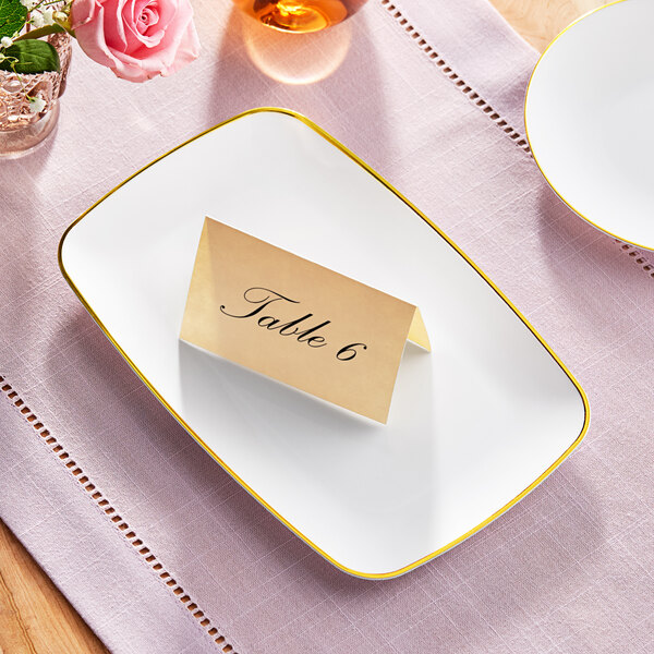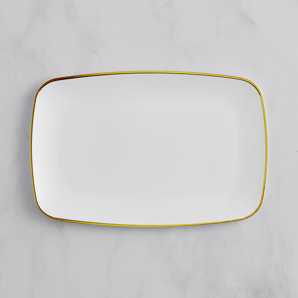 Visions 9 1/2" x 6 1/4" White Rectangular Plastic Coupe Platter with Gold Band - 120/Case