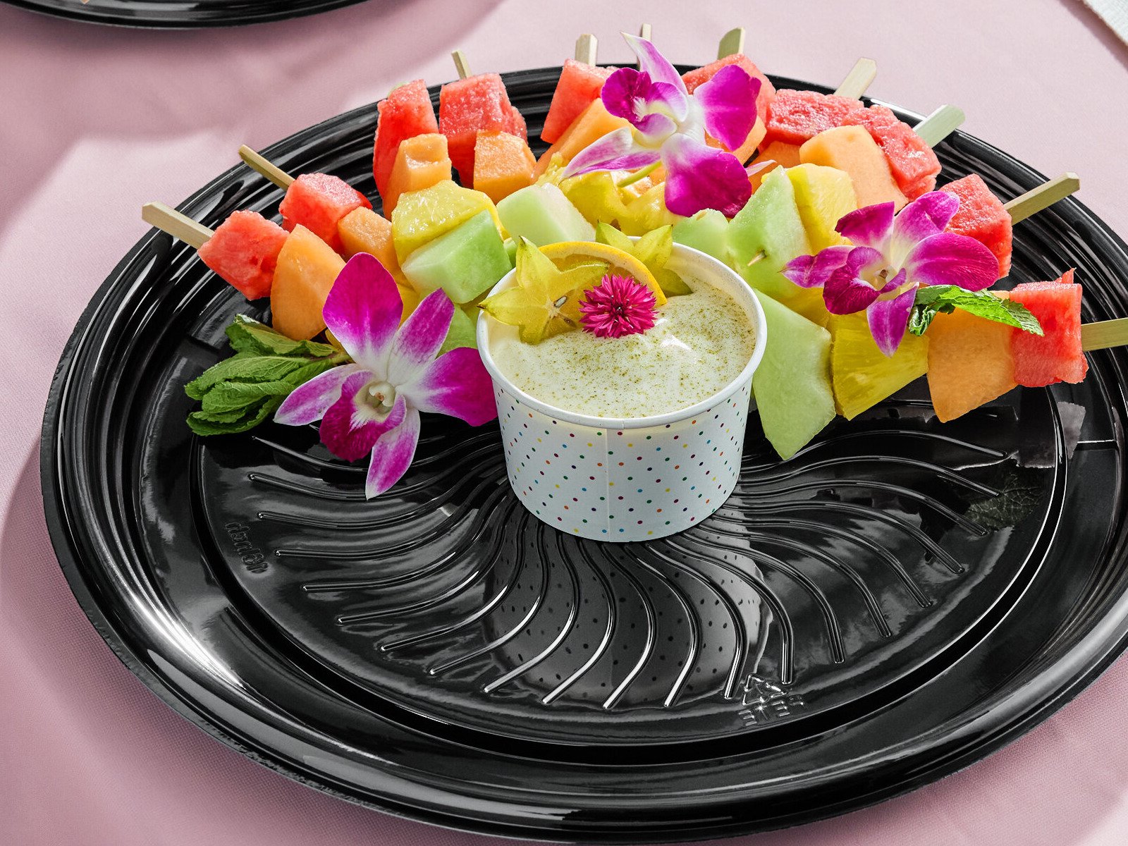 This Visions 16" PET plastic catering / deli tray is perfect for displaying hors d'oeuvres, cheeses, and desserts at your next party or catered meal. A clear plastic dome lid is also available (sold separately) to help you keep your platters fresh and free of contaminants. For your convenience, this tray makes cleanup a breeze! Simply dispose of the tray when you are finished using it.