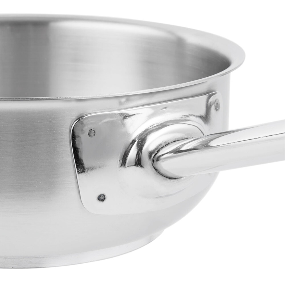 The Vollrath 3152 Centurion pan features a 1/4" thick aluminum-clad bottom for quick, even heat distribution. A thin bottom wafer of stainless steel provides increased durability, and makes this saute pan induction ready.