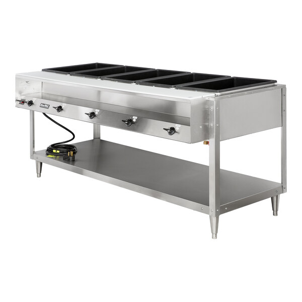 To make sure that you have plenty of space to store extra food pans, serving utensils, or other commonly used kitchen tools, this steam table comes with an undershelf. The undershelf is made of durable, corrosion-resistant stainless steel to last for a long time in your busy commercial environment.
