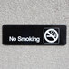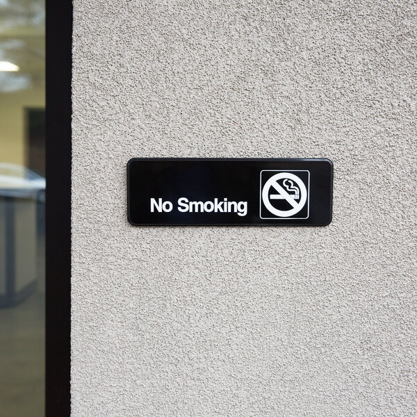 Make it known that smoking is not permitted, with this Vollrath 4513 Traex® no smoking sign. This 9" x 3" sign is printed with "No Smoking" in bright white font. Accompanying graphics reinforce there's no smoking permitted. The font and graphics both offer a distinct contrast to the durable black plastic sign, ensuring visibility near or far.
