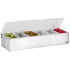 Keep the serving station at your bar, countertop, or buffet line perfectly organized with the help of this Vollrath 4705 Traex® Kondi-Keeper™ 3-compartment stainless steel condiment bar with (3) 1-quart inserts. With a stainless steel design, this condiment bar offers a sleek, contemporary addition to your establishment. Attractive as well as functional, you can use this dispenser to draw attention to condiment offerings such as olives, orange slices, or berries. You can use this condiment bar to organize ingredients at your taco bar or omelette station, toppings at your ice cream bar, or drink garnishes at your bar. With three separate compartments, it's easy to simply open up the hinged lid and grab whatever you need to top off a signature cocktail. The lid is also transparent so you can always see when your supply is running low! When not in use, the lid keeps your offerings fresh and safe from debris.