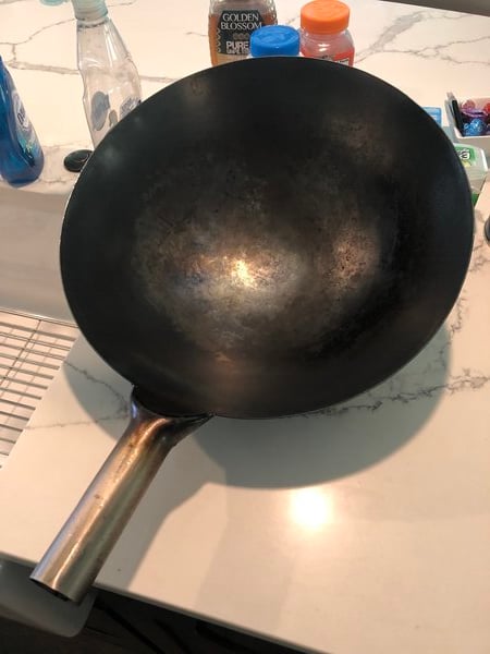 This wok seasoned easily and well using the high heat method.The handle gets a little warm, but not hot, so you can hold on to it throughout the cooking without a glove. The bowl has a nice curve that fits my wok burner well. A nice wok, traditional in appearance and performance.