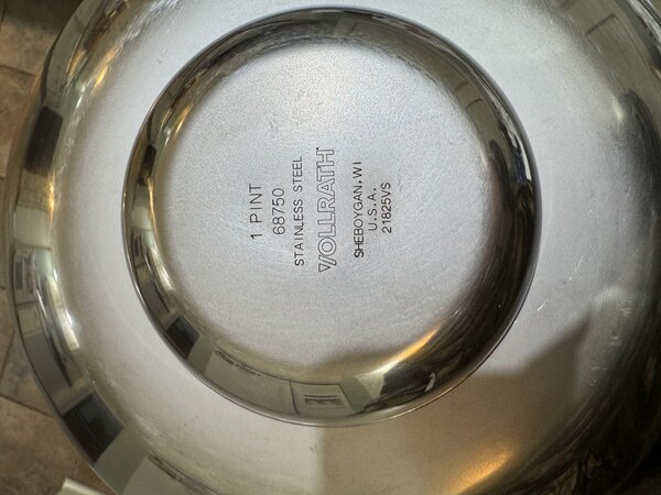 The good: The weight, design, and construction of these bowls is incredibly nice, the best I've found so far. It would be a 5 star if not for this: The disappointing: The interior satin finish is definitely not my preference. it looks like dull old aluminum and it's nature is that appears somewhat dirty and oxidized after cleaning.. Scratches from a single use of Danish mixing whisk left very visible scratches, and it looks worse than a shiny scratched bowl, as those eventually develop a patina that becomes a dull glow. These scratches show up as darker gray. The interior urface.is almost rough to the touch, almost like raw metal. Vollrath says the interior is stain and scratch resistant and creates a smooth attractive appearance. This is just marketing gibberish. Compared to shinier finish, It shows fingerprints, water marks, scratches much more visibly, and it's literally less Read More