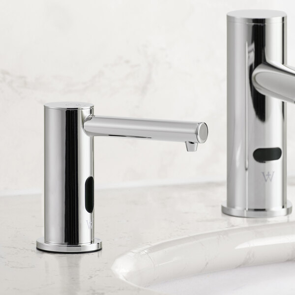 Enhance the cleanliness and efficiency of your commercial restroom with the Waterloo automatic deck-mounted chrome soap dispenser with foam spout.