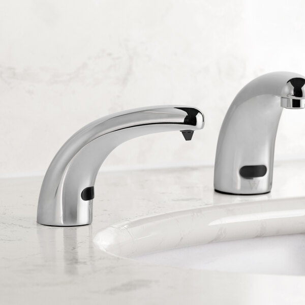 Enhance the cleanliness and efficiency of your commercial restroom with the Waterloo automatic deck-mounted rounded chrome soap dispenser with foam spout.