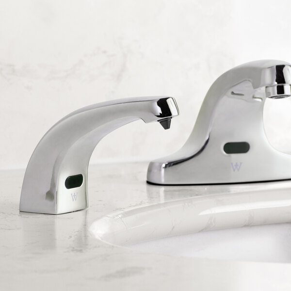 Enhance the cleanliness and efficiency of your commercial restroom with the Waterloo automatic deck-mounted squared chrome soap dispenser with foam spout.