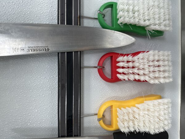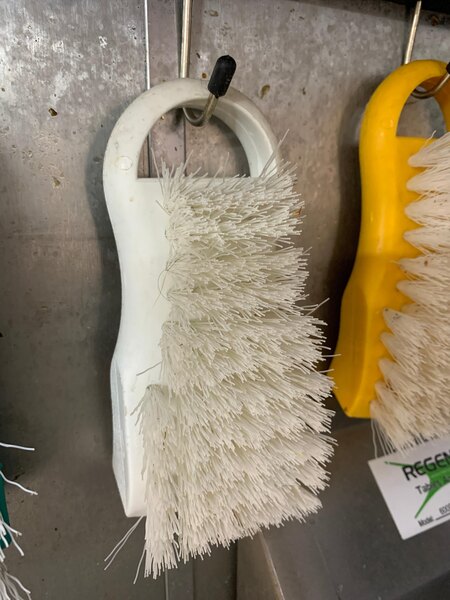 The tough bristles of this brush stay rooted in place even with aggressive scrubbing, and can easily reach into cuts and grooves on cutting boards to clean out tough-to-reach food particles and fight the spread of bacteria. Unlike brushes with steel bristles, this brush is designed to be soft enough not to damage your cutting boards, but still provide an effective clean. Use the loop on the end of the brush to keep this brush handy or hang it to dry on a cutting board rack. This brush is part of a color-coded system that prevents cross-contamination and engages in food allergy management. Use this white brush to clean your white cutting boards (ideally used for bakery items).