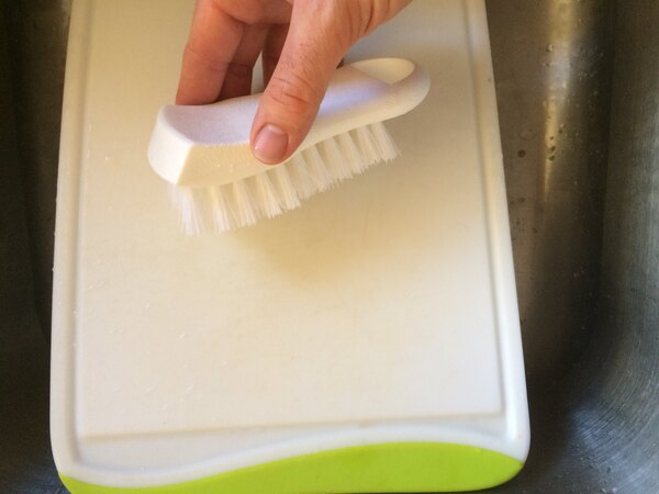 This brush has been great for scrubbing down the hard to get off particles on our cutting boards. It doesn't lift the material of the cutting board and isn't so harsh that it scratches it. The hook is also helpful for hanging it to dry well.