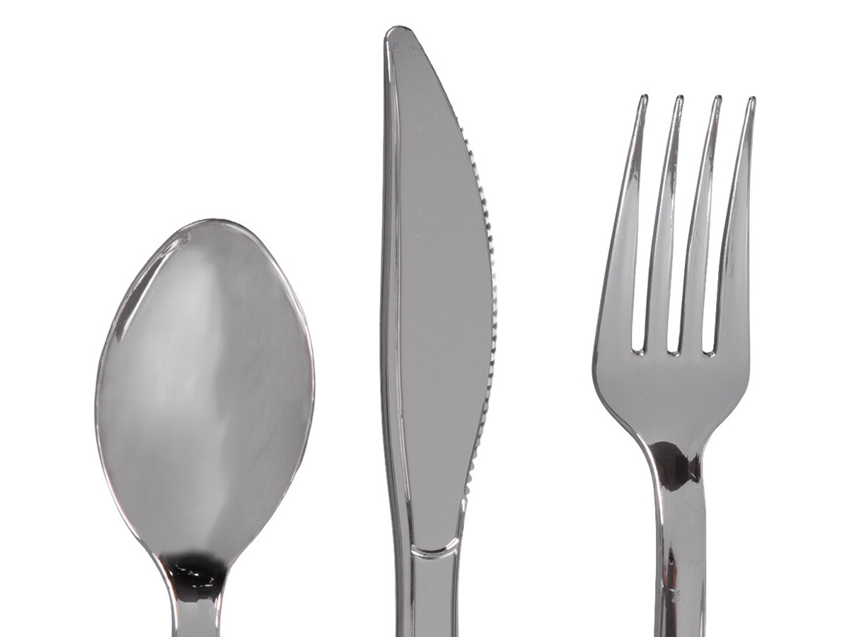 This set includes a extra heavy weight plastic knife, fork, and spoon with a stainless steel look that provides an upscale feel.