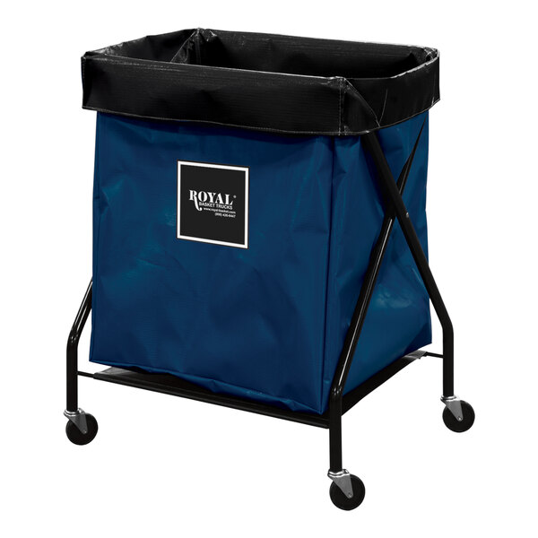 Conveniently collect and transport laundry, equipment, and recyclables with this Royal Basket Trucks 8 cu. ft. navy blue X-frame cart. This cart's frame is made with durable tubular steel, boasting excellent support and stability. The included vinyl bag is flame retardant and mold-, mildew-, UV-, and tear-resistant. Plus, it's easy to clean by simply wiping it down with a mild detergent, ensuring that it stays in great condition for repeated use.