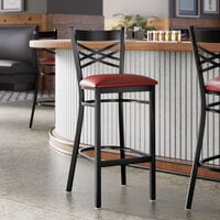 Products You May Need For Lancaster Table & Seating Black Finish Cross Back Swivel Bar Stool with 2 1/2" Burgundy Vinyl Padded Seat
