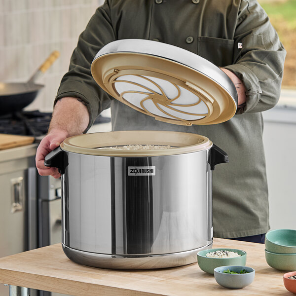 This container is versatile and can be used in your establishment's kitchen or for catered events. With excellent heat retention, it can keep up to 66 cups of cooked rice warm for a maximum of 6 hours, at 180 degrees Fahrenheit. After your rice has been prepared in a rice cooker, transfer it to this thermal, stainless steel container to keep it at the proper consistency and temperature for your dishes.